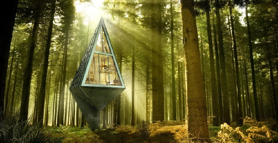 По форме лесной дом напоминает перевернутую пирамиду, его площадь составляет 61 кв. метр. Он рассчитан на двух человек.