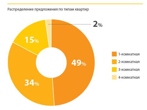 В структуре объёма предложения преобладают однокомнатные квартиры – 49% , на втором месте находятся двухкомнатные – 34%.