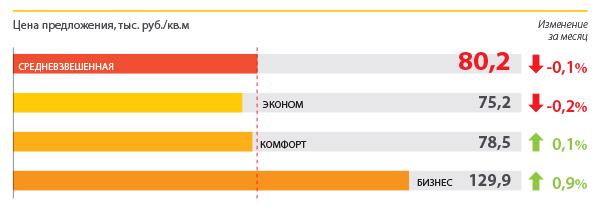 Средневзвешенная цена предложения незначительно скорректировалась в сторону уменьшения (минус 0,1%) и составила 80,2 тыс. руб. за кв. м, что соответствует 1 234 долл. за кв. м.