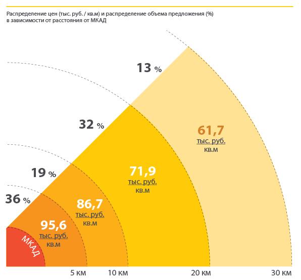 Наибольшая доля предложения сконцентрирована в зоне до 5 км от МКАД – 36%, в поясе от 10 до 20 км от МКАД – 32%, при этом в зоне от 5 до 10 км и в зоне от 20 до 30 км от МКАД – 19% и 13% соответственно.