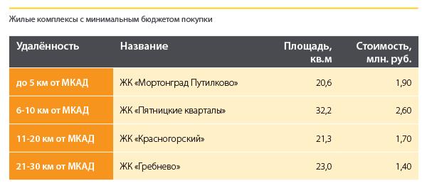 На данный момент наиболее бюджетное предложение в зоне до 5 км от МКАД представлено в ЖК «Мортонград Путилково», где студию площадью 20,6 кв. м можно приобрести за 1,9 млн рублей.