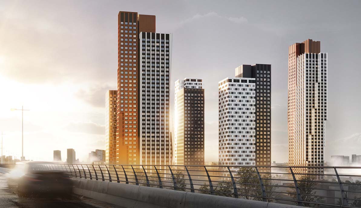Новый жилой комплекс – это три монолитно-кирпичных здания. Два из них представляют собой жилые небоскребы высотой до 42 этажей – Серебряная и Бронзовая башни. Оформлены они будут в соответствующем названию цвете. Третье сооружение – 28-этажный бизнес-центр. Архитектурную концепцию проекта разработало бюро IND.