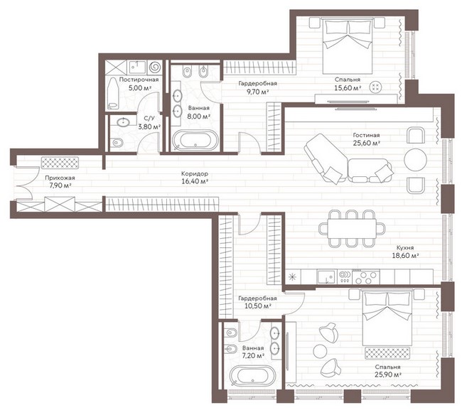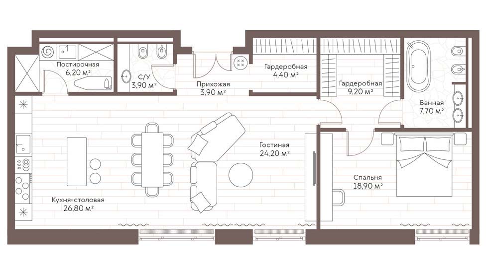 Двадцать шесть резиденций проекта — это холсты для индивидуального творчества. Пространства площадью от 96 до 615 квадратных метров с потолками до 3,75 метров предлагают свободу для воплощения самых смелых архитектурных замыслов. Панорамное остекление превращает свет в полноправный элемент интерьера, а из окон открываются знаковые виды на историческую Москву. Ключевая философия — предоставить возможность создать дом "с нуля", поэтому квартиры передаются без отделки. Это высшая степень доверия к будущему владельцу, позволяющая учесть каждую потребность: обустроить мастер-спальни с гардеробными и личными банными комнатами, выделить кабинет-библиотеку или спроектировать грандиозную гостиную для приёмов.