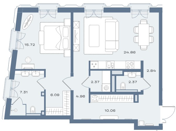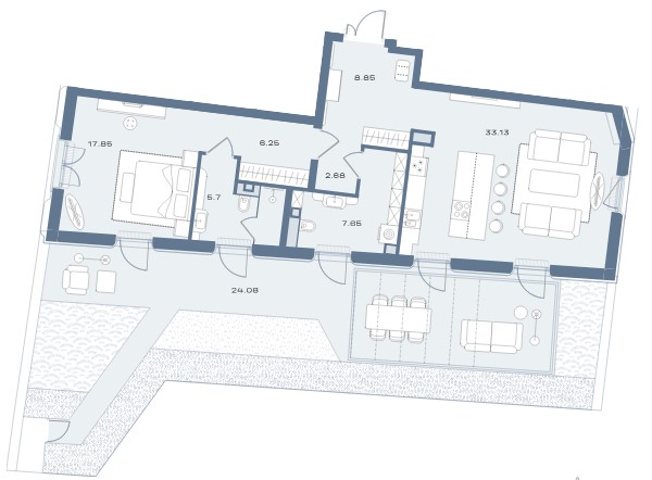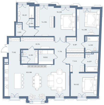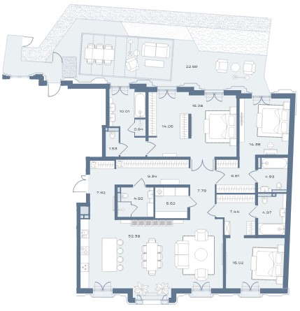 Внутри корпусов расположится всего 33 эксклюзивные резиденции, включая пентхаусы. Планировочные решения продуманы для максимального комфорта: просторные кухни-гостиные, мастер-спальни с двусторонним освещением, отдельные гардеробные и постирочные зоны. Особый шарм интерьерам придают эркерные выступы и панорамное остекление, наполняющие пространства светом. Верхней точкой проекта становятся двухуровневые пентхаусы с высотой потолков около 4 метров, частными террасами и впечатляющими панорамами центра Москвы. Все квартиры передаются без отделки, что даёт будущим владельцам свободу для реализации индивидуальных дизайнерских решений.
