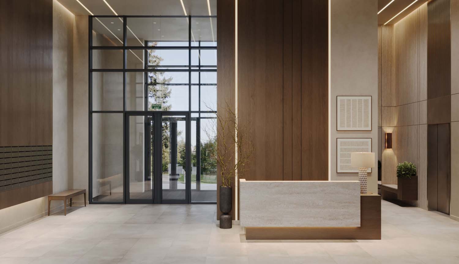 Дизайн лобби является продолжением основной концепции и отличается четкостью форм и фактурностью. Четкие линии уравновешивает теплый свет, а природные оттенки обеспечивают домашнюю уютную атмосферу. Для резидентов предусмотрены зона ожидания с комфортной мебелью, комнаты для хранения колясок и велосипедов, места для переговоров и работы.
