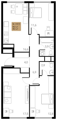 - 3-комнатные от 76,1 кв.м., стоимость от 22,7 млн рублей.