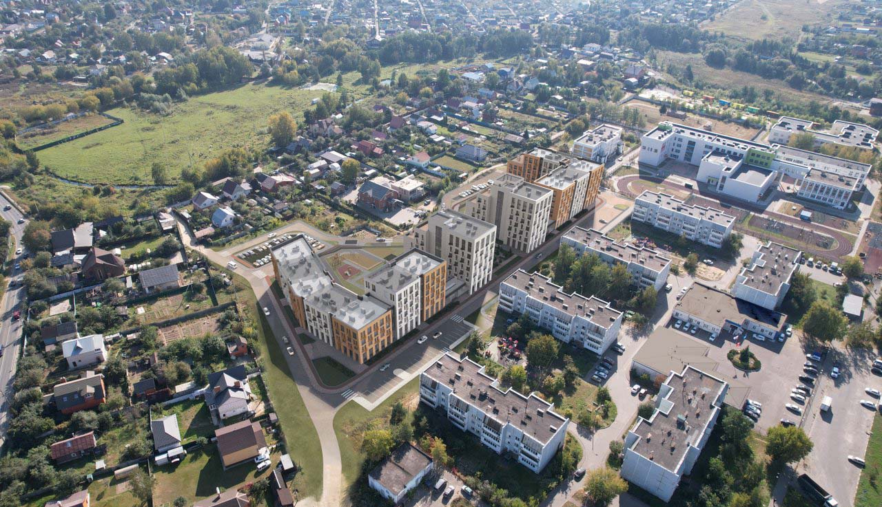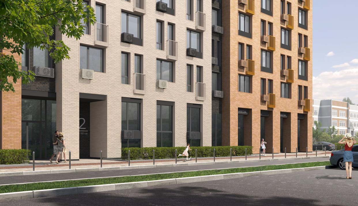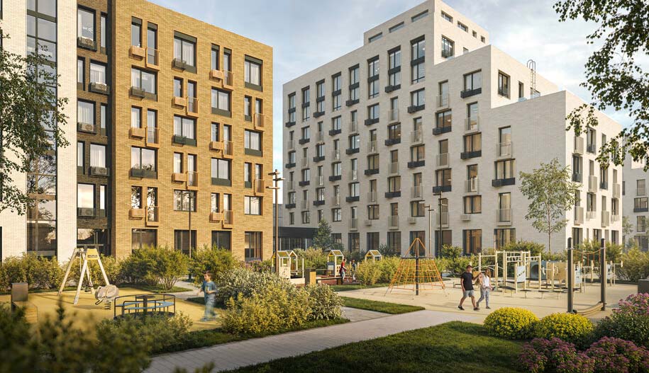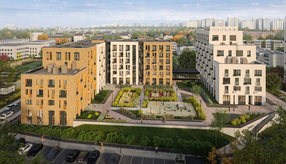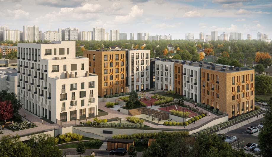 Будущий квартал достаточно компактный – всего два корпуса высотой от 4 до 7 этажей. Небольшая этажность обеспечит двор и квартиры хорошей инсоляцией. Для отделки фасадов зданий используется светлый кирпич, благодаря чему комплекс отлично вписываются в текущую застройку Подмосковья.