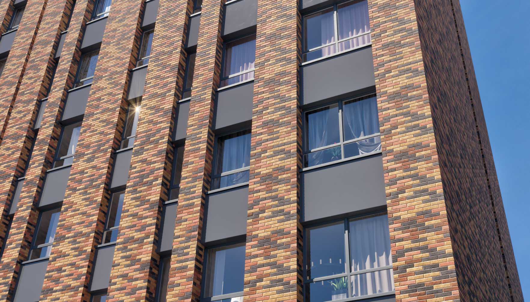 Новостройка состоит из одного кирпично-монолитного здания высотой 16 этажей. Здание выполнят в современном европейском стиле, отличительными особенностями станут панорамные окна, оригинальные формы, объемные фасады, прямоугольные колонны с зубцами на вершинах. Для облицовки фасадов используют кирпич разных оттенков. Застройщик также позаботился о высоком уровне шумоизоляции, хорошем освещении помещений, комфорте и безопасности. Так, на территории апарт-отеля будут работать камеры круглосуточного видеонаблюдения, охранно-пожарная сигнализация и пр.