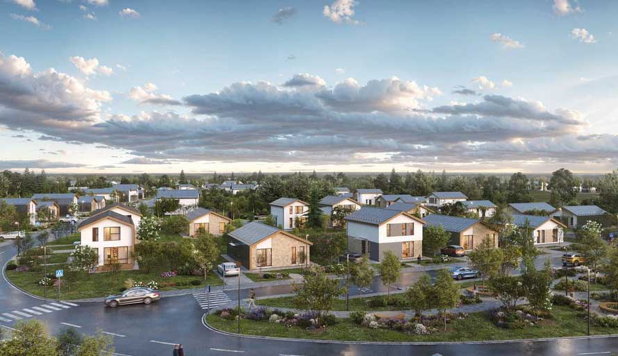 На территории площадью 645 гектаров компания возведёт свыше 1,4 домов в едином стиле. Архитектурная концепция отличается выразительностью и основывается на принципах простоты и функциональности. Все здания выполняют в стиле "барнхаус", благодаря чему они выглядят современно и лаконично. Фасады коттеджей выполнят с использованием различных материалов, среди которых штукатурка светлых и серых оттенков, плитка "под кирпич". Выбранная цветовая гамма отлично вписывает дома в окружающую среду. Здания возводят из газобетона, такой материал обеспечивает надежность, тепло- и энергоэффективность.