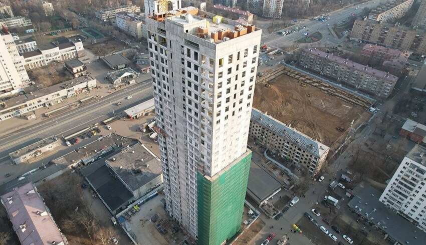 На первом этапе реализации проекта по кирпично-монолитной технологии строится одно 31-этажное жилое здание. Башня имеет стильный современный облик, особенностью которого станут фасады в трех цветовых решениях и элементы декора под разными углами, придающие всему образу динамики и рельефности. Фасады башни вентилируемые, первый этаж облицован клинкерным кирпичом, выше – плитами в оттенках серого. Для внешних блоков кондиционеров предусмотрены корзины, стилизованные под общую концепцию.