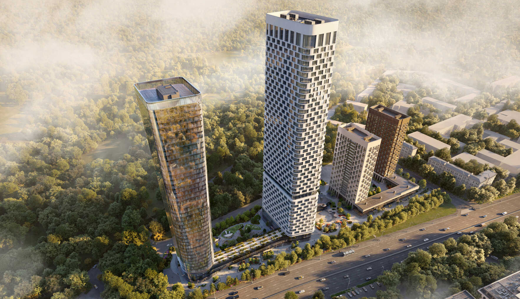 На участке 2,6 га девелопер возводит две башни высотой 41 и 49 этажей на общем стилобате. Внешне здания кажутся совсем прозрачными, такой эффект достигается за счёт полного остекления фасадов панорамными окнами. В строительстве компания применяет натуральные материалы, которые имеют отличные характеристики качества: металл, камень, стекло. Плавности зданиям придает использование разных фактур и материалов. Основание одной из башни имеет форму кругу, другой – спирали. Однако после 10 этажа оба силуэта принимают строгие контуры. Уникальные формы новых домов в темное время суток подчеркнет стильная архитектурная подсветка.